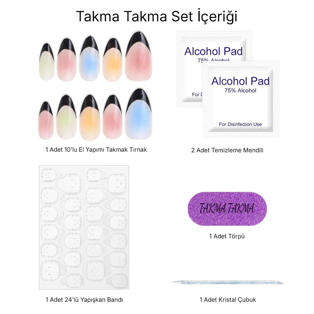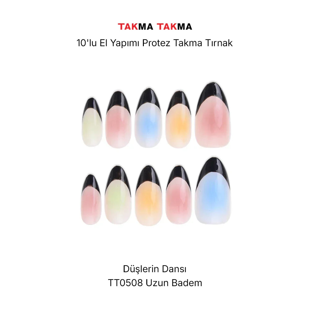 10'lu Renkli Uzun Badem TT0508 Tekrar Kullanılabilir El Yapımı Protez Takma Tırnak