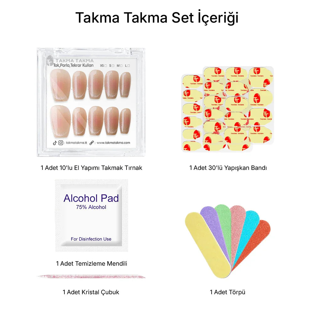 TakmaTakma tırnaklarınızı istediğiniz zaman çıkarıp tekrar takabilirsiniz, üstelik zahmetsizce! İstediğiniz gibi kullanabilir, her an şıklığınızı yenileyebilirsiniz.