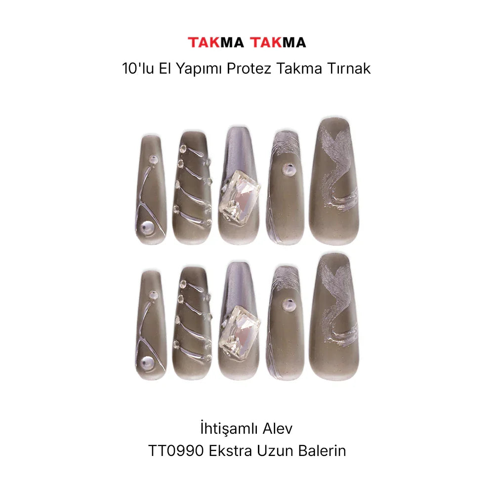 10'lu Gri Ekstra Uzun Balerin TT0990 Tekrar Kullanılabilir El Yapımı Protez Takma Tırnak