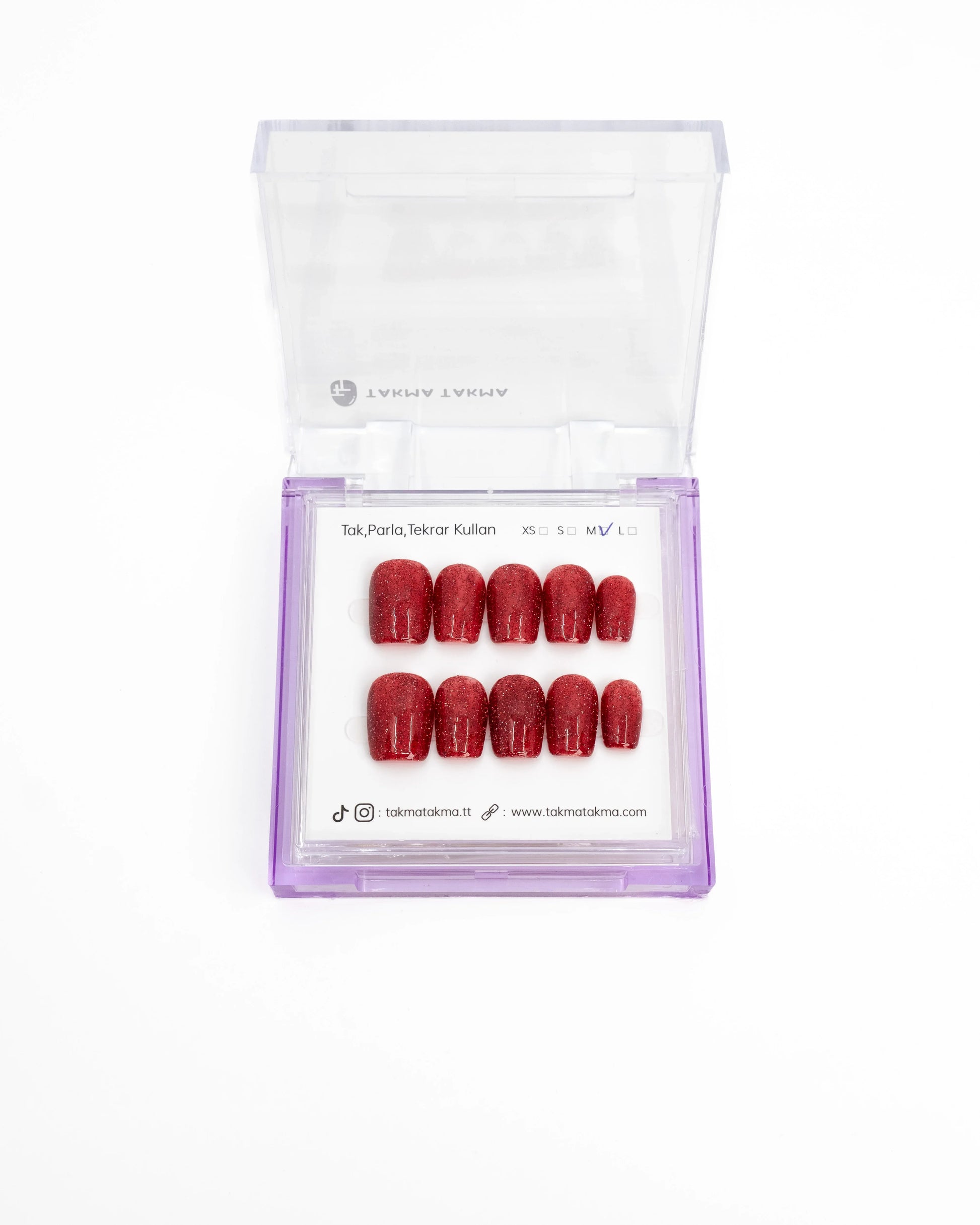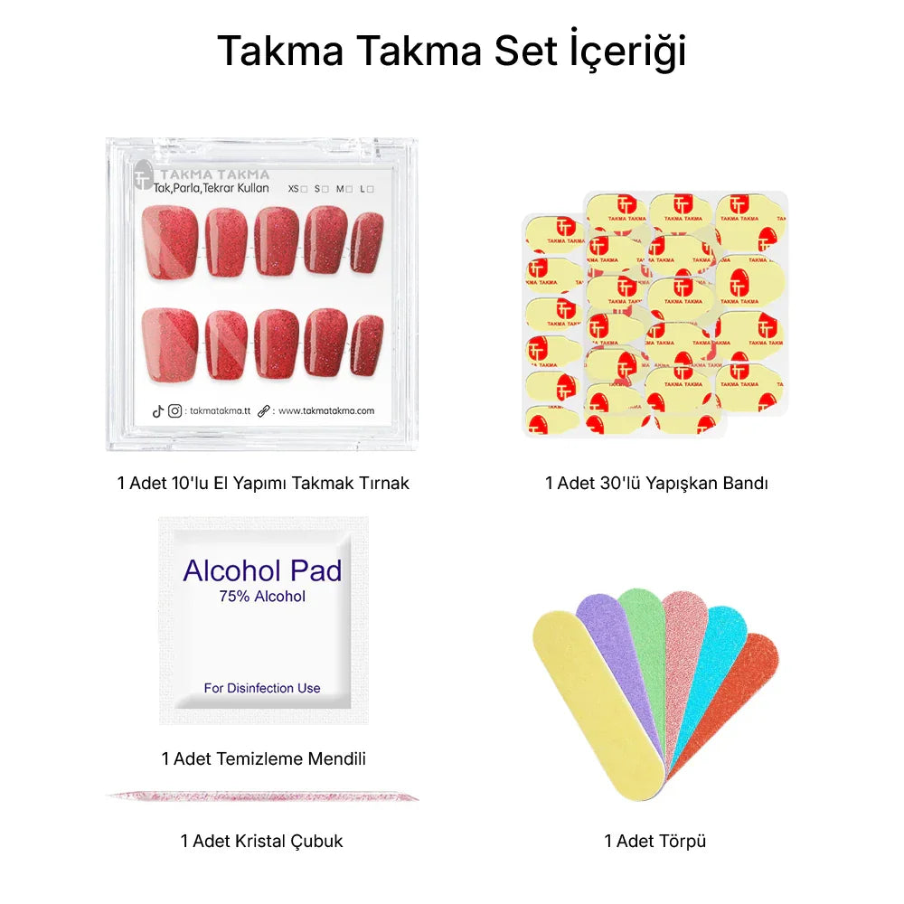 TakmaTakma tırnaklarınızı istediğiniz zaman çıkarıp tekrar takabilirsiniz, üstelik zahmetsizce! İstediğiniz gibi kullanabilir, her an şıklığınızı yenileyebilirsiniz.