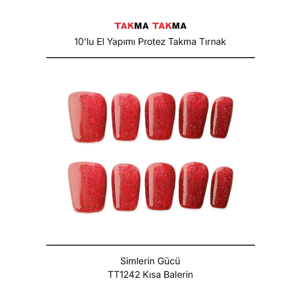 10'lu Kırmızı Kısa Balerin TT1242 Tekrar Kullanılabilir El Yapımı Protez Takma Tırnak