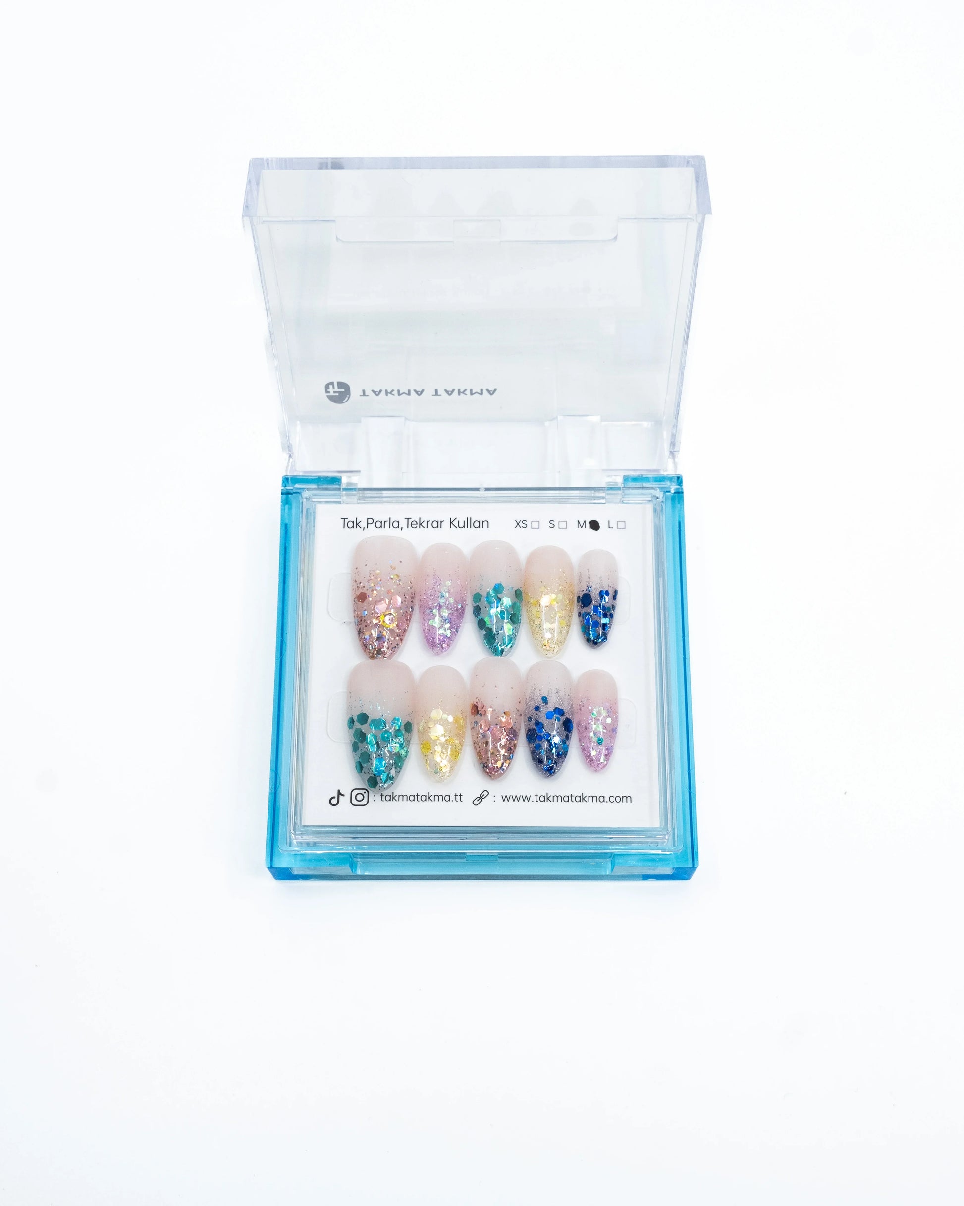 Kısa süreli ışıltılar için ideal. Nazik yapışkan bantlarımızla kolayca takabilir ve 5-7 gün boyunca harika tırnaklara sahip olabilirsiniz.