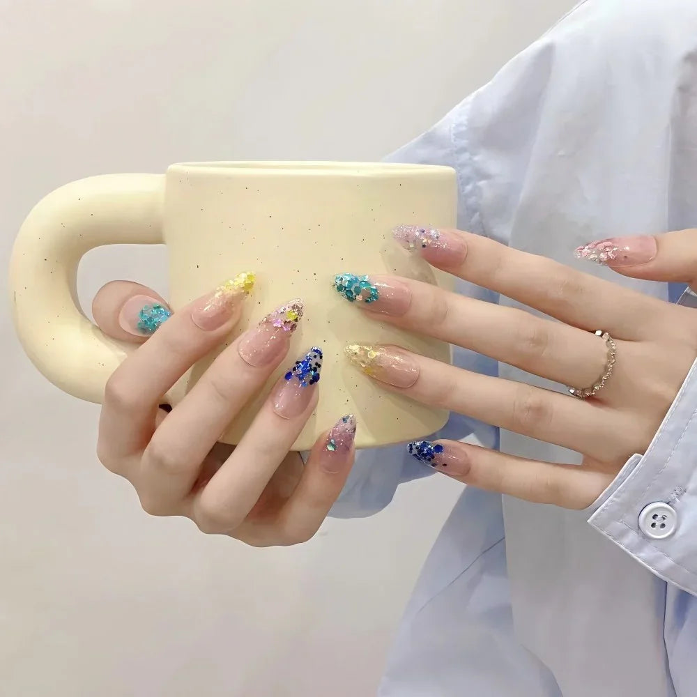 10'lu Renkli Uzun Badem TT1183 Tekrar Kullanılabilir El Yapımı Protez Takma Tırnak