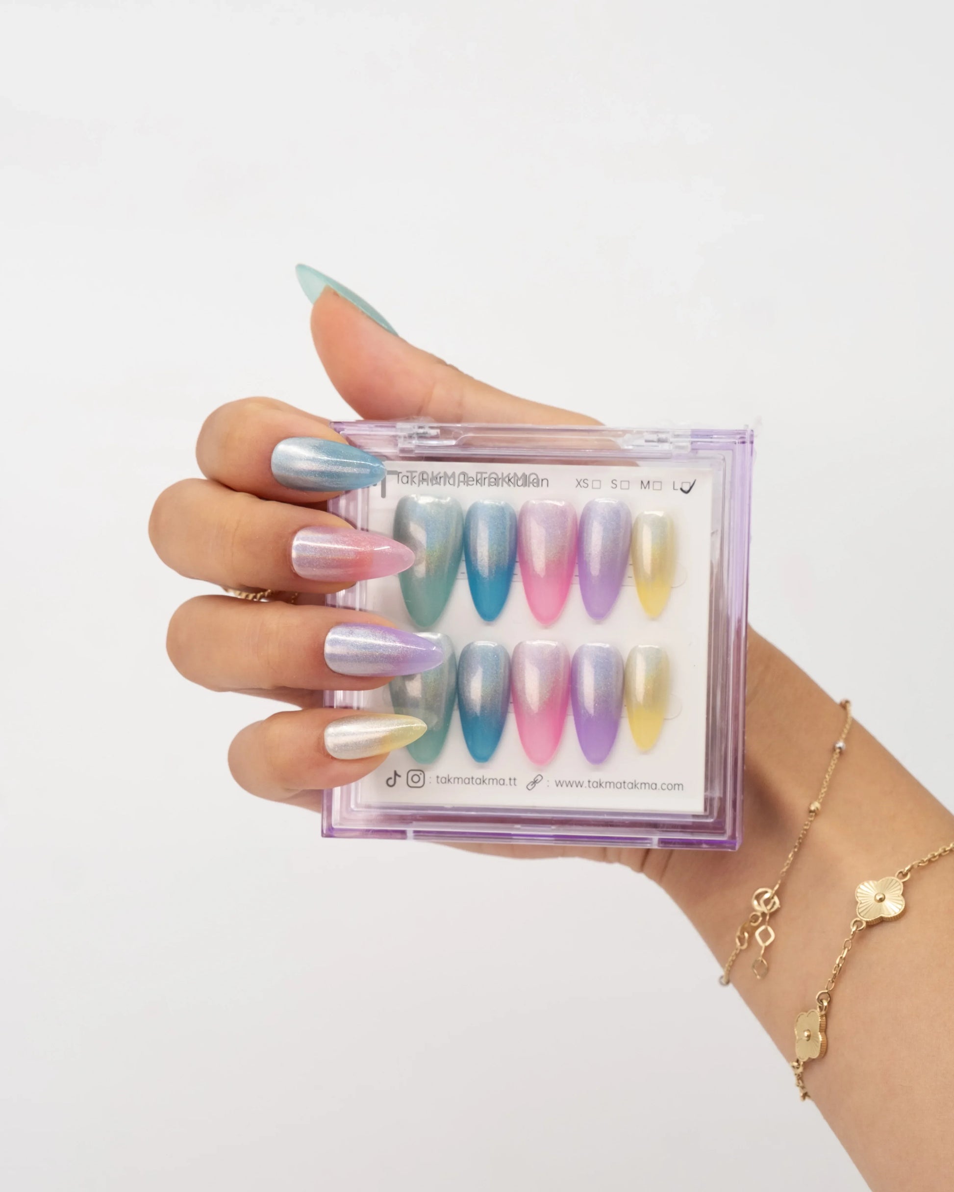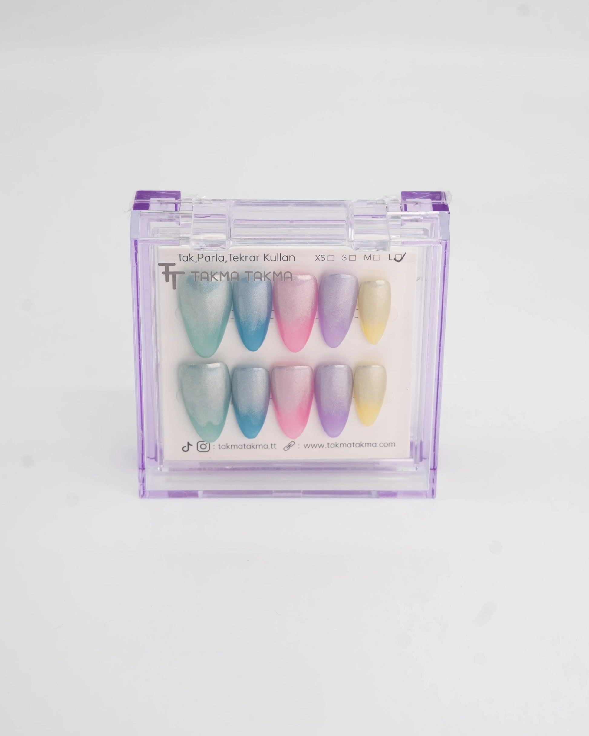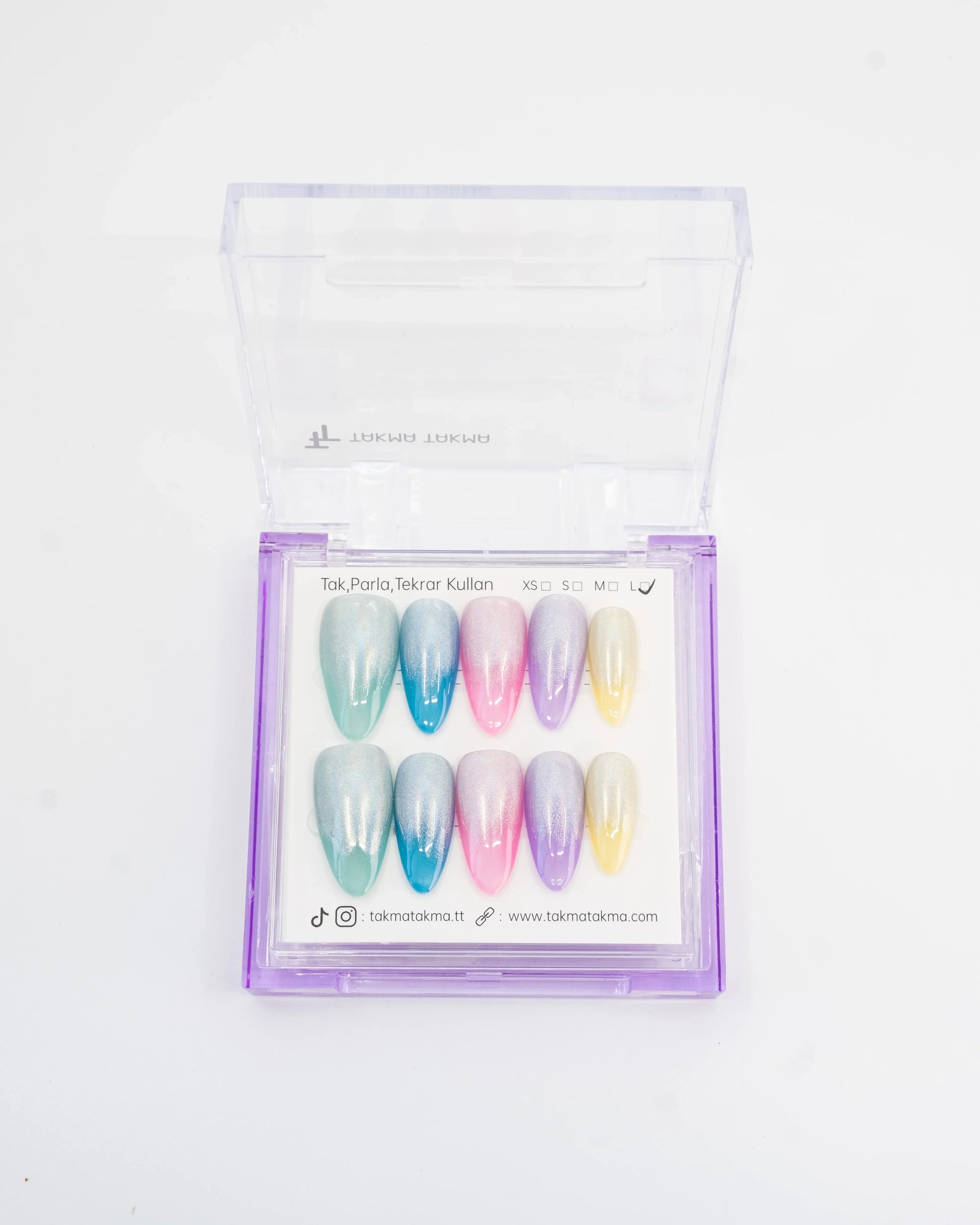 TakmaTakma tırnaklarınızı istediğiniz zaman çıkarıp tekrar takabilirsiniz, üstelik zahmetsizce! İstediğiniz gibi kullanabilir, her an şıklığınızı yenileyebilirsiniz.