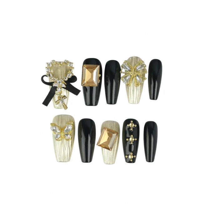 10'lu Siyah TT0153 Uzun Balerin Tekrar Kullanılabilir El Yapımı Protez Takma Tırnak
