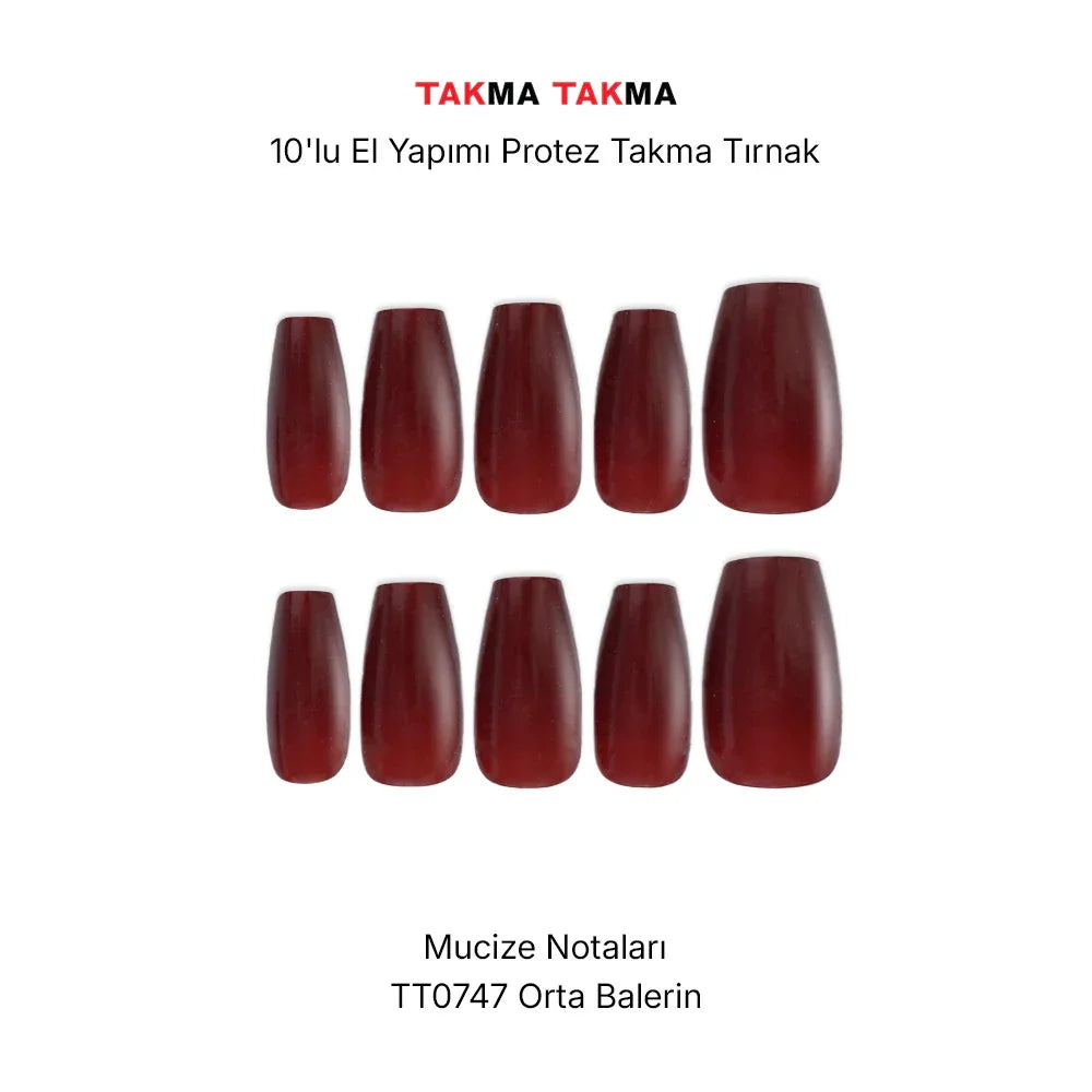10'lu Bordo Orta Balerin TT0747 Tekrar Kullanılabilir El Yapımı Protez Takma Tırnak