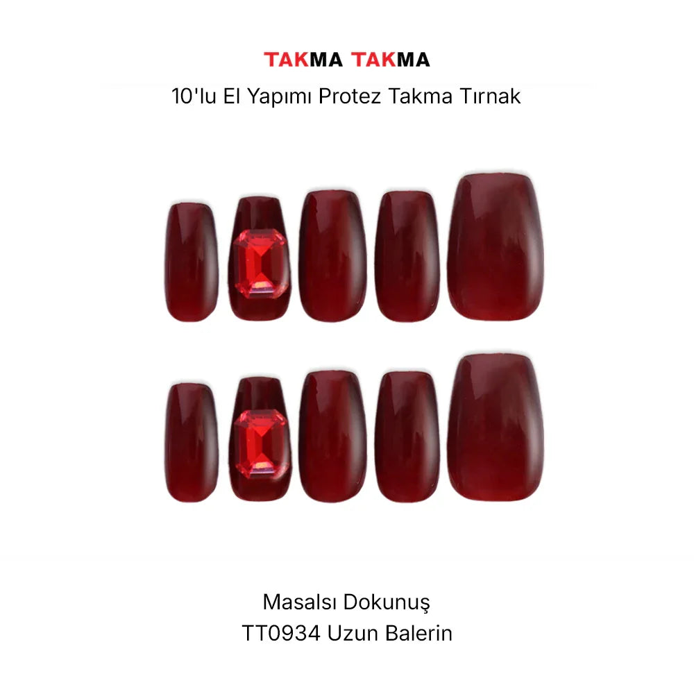 10'lu Kırmızı Uzun Balerin TT0934 Tekrar Kullanılabilir El Yapımı Protez Takma Tırnak