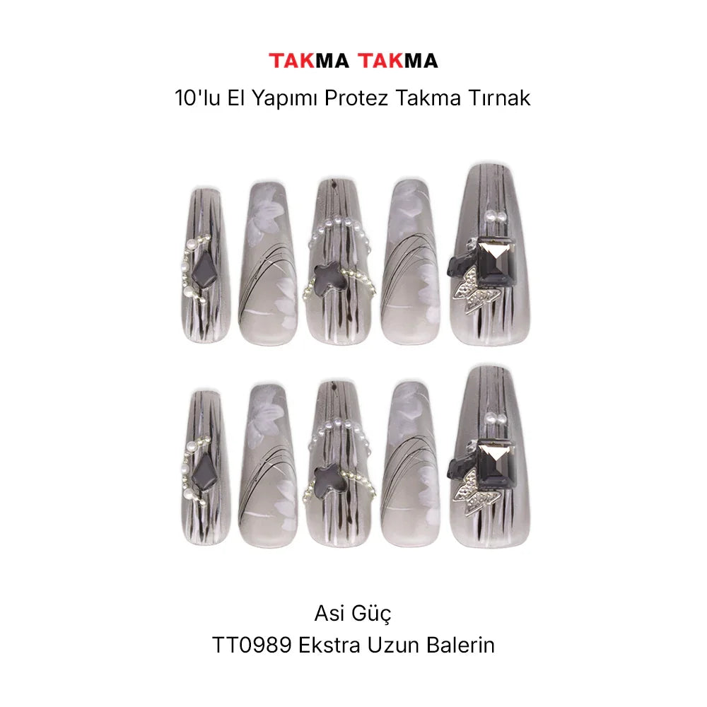 10'lu Gri Ekstra Uzun Balerin TT0989 Tekrar Kullanılabilir El Yapımı Protez Takma Tırnak