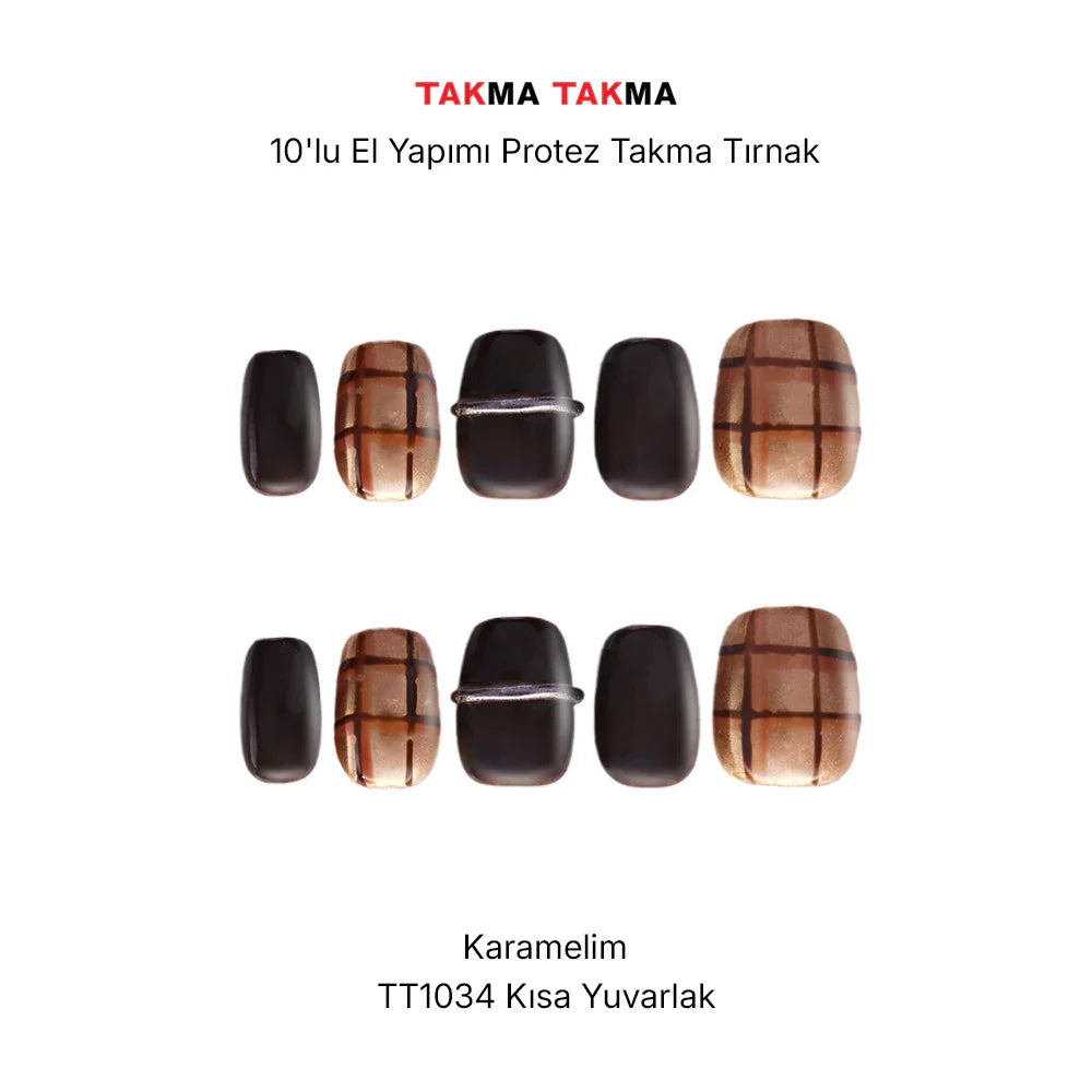 10'lu Kahverengi Kısa Yuvarlak TT1034 Tekrar Kullanılabilir El Yapımı Protez Takma Tırnak