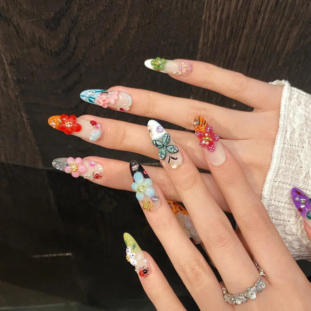 10'lu Renkli Uzun Oval TT1328 Tekrar Kullanılabilir El Yapımı Protez Takma Tırnak