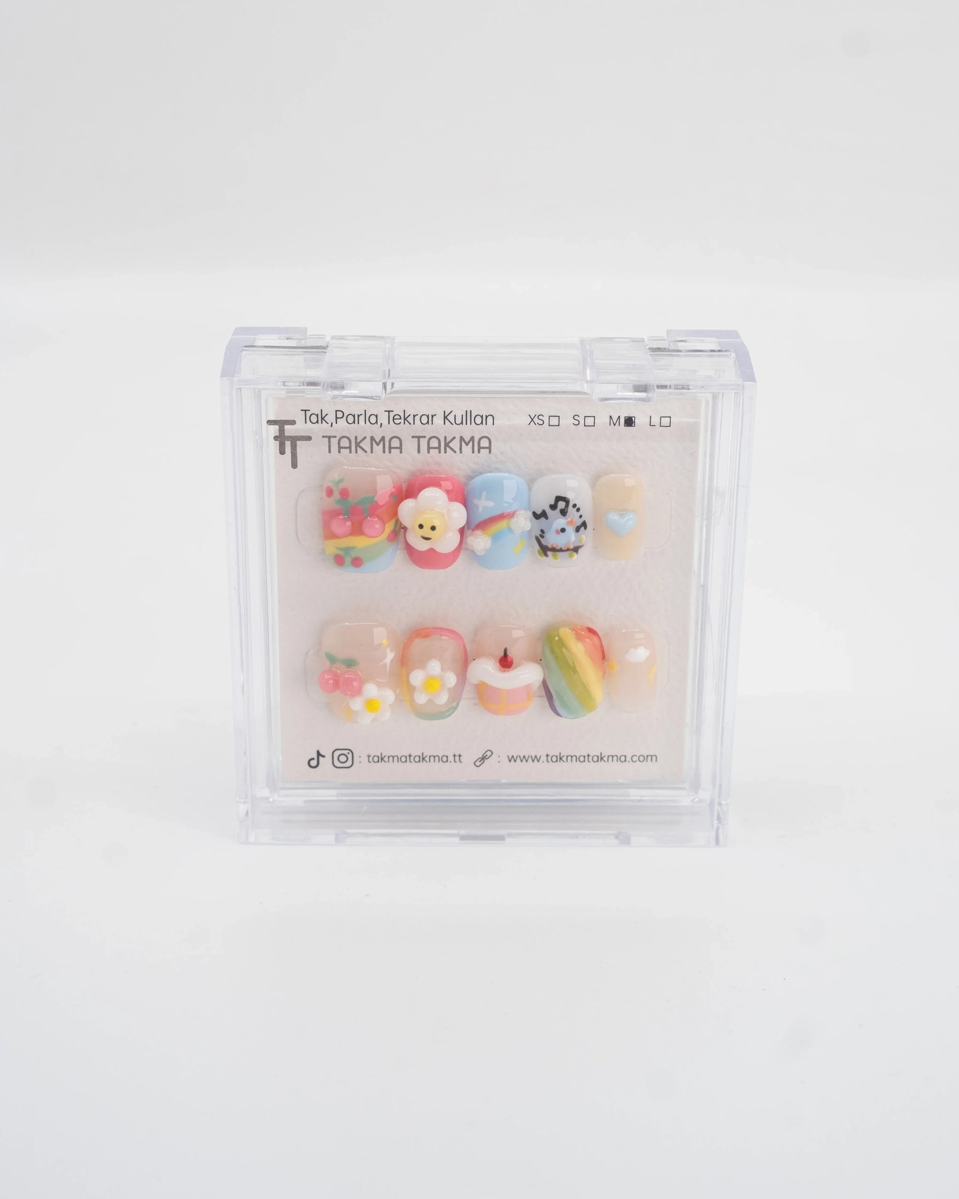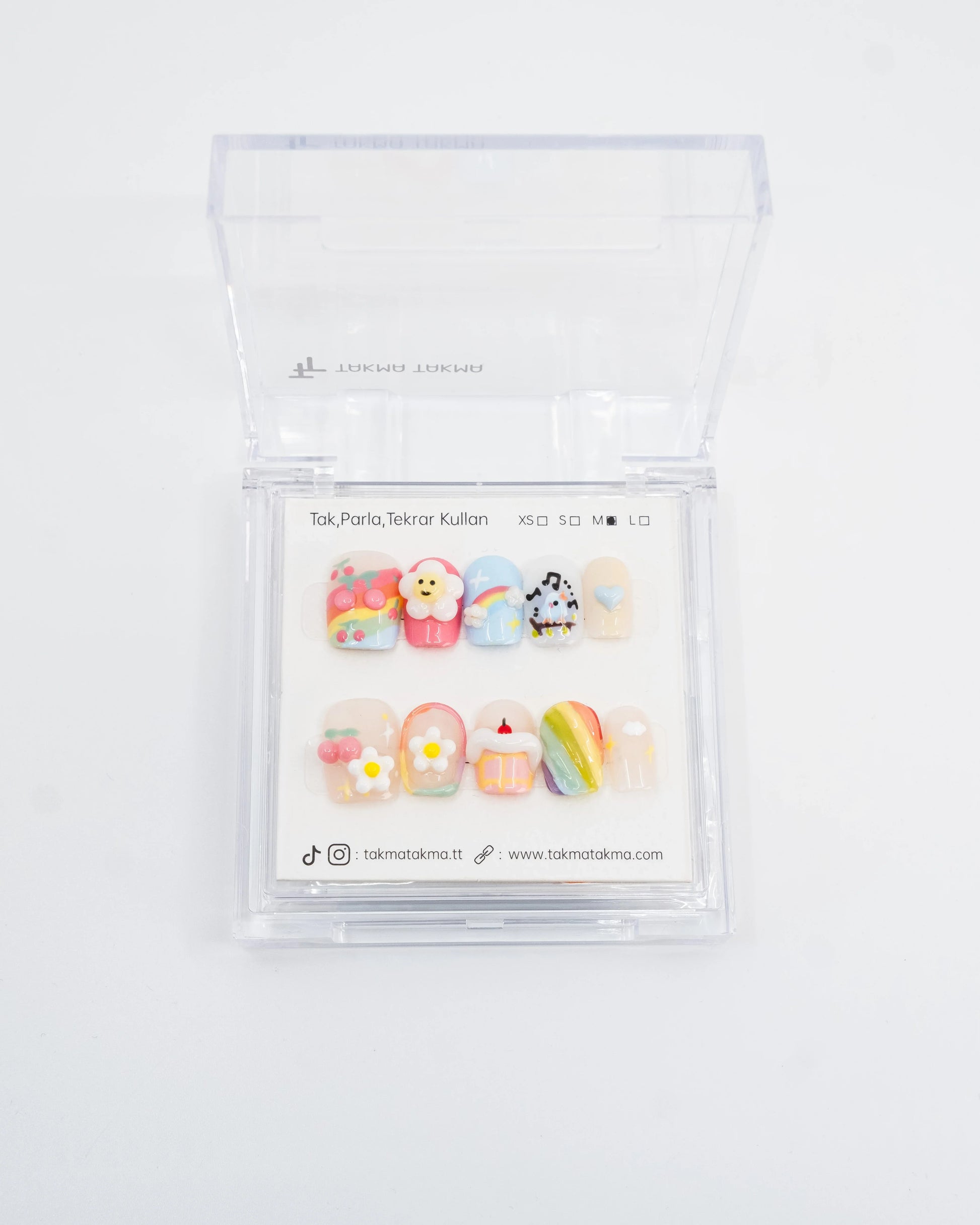TakmaTakma tırnaklarınızı istediğiniz zaman çıkarıp tekrar takabilirsiniz, üstelik zahmetsizce! İstediğiniz gibi kullanabilir, her an şıklığınızı yenileyebilirsiniz.