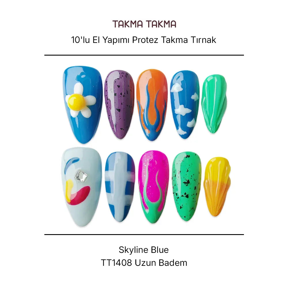 10'lu Renkli Uzun Badem TT1408 Tekrar Kullanılabilir El Yapımı Protez Takma Tırnak