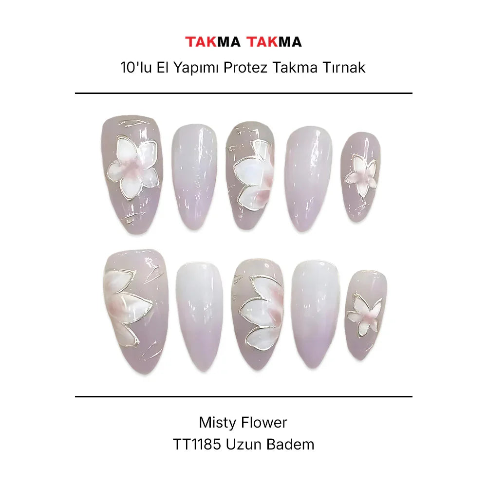 10'lu Beyaz Uzun Badem TT1185 Tekrar Kullanılabilir El Yapımı Protez Takma Tırnak