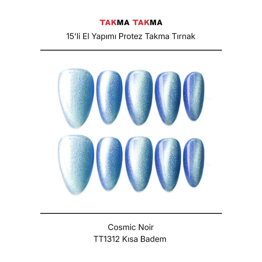 15'li Mavi Kısa Badem TT1312 Tekrar Kullanılabilir El Yapımı Protez Takma Tırnak