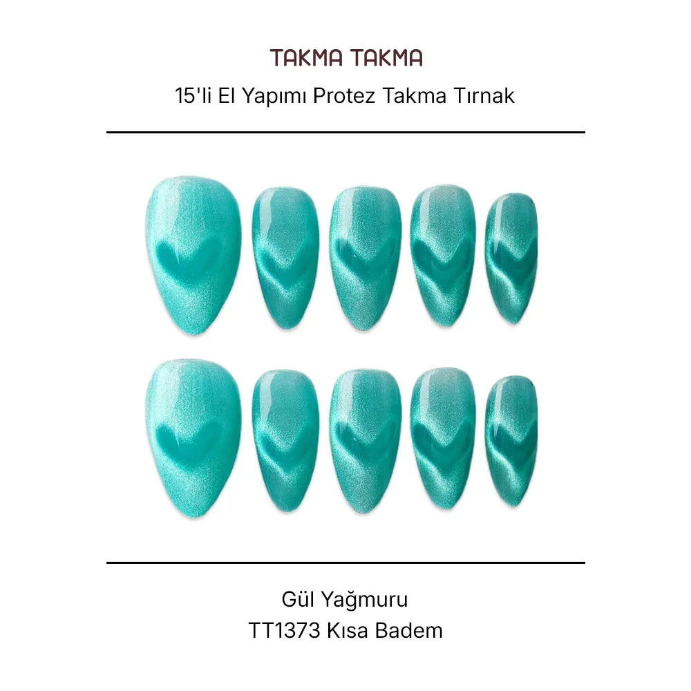 15'li Yeşil Kısa Badem TT1373 Tekrar Kullanılabilir El Yapımı Protez Takma Tırnak