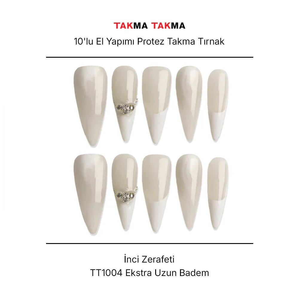 10'lu Beyaz Uzun Badem TT1004 Tekrar Kullanılabilir El Yapımı Protez Takma Tırnak