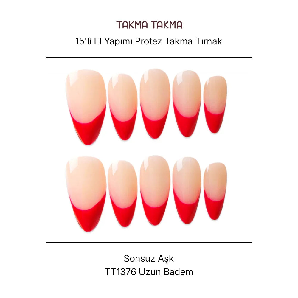 15'li Kırmızı Uzun Badem TT1376 Tekrar Kullanılabilir El Yapımı Protez Takma Tırnak
