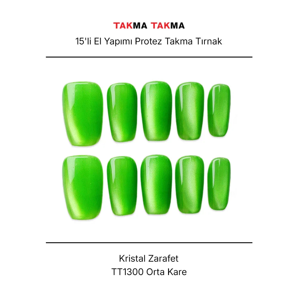 15'li Yeşil Orta Kare TT1300 Tekrar Kullanılabilir El Yapımı Protez Takma Tırnak