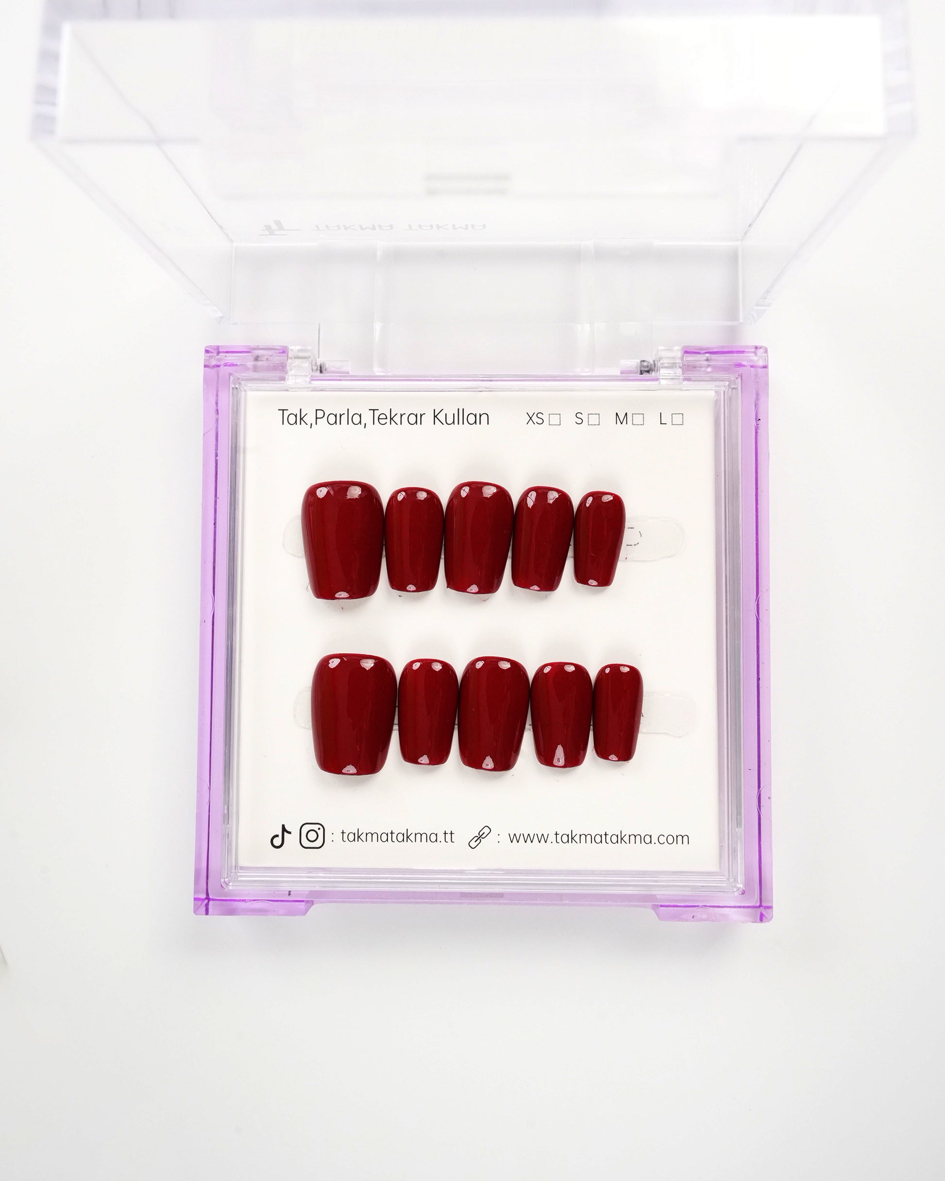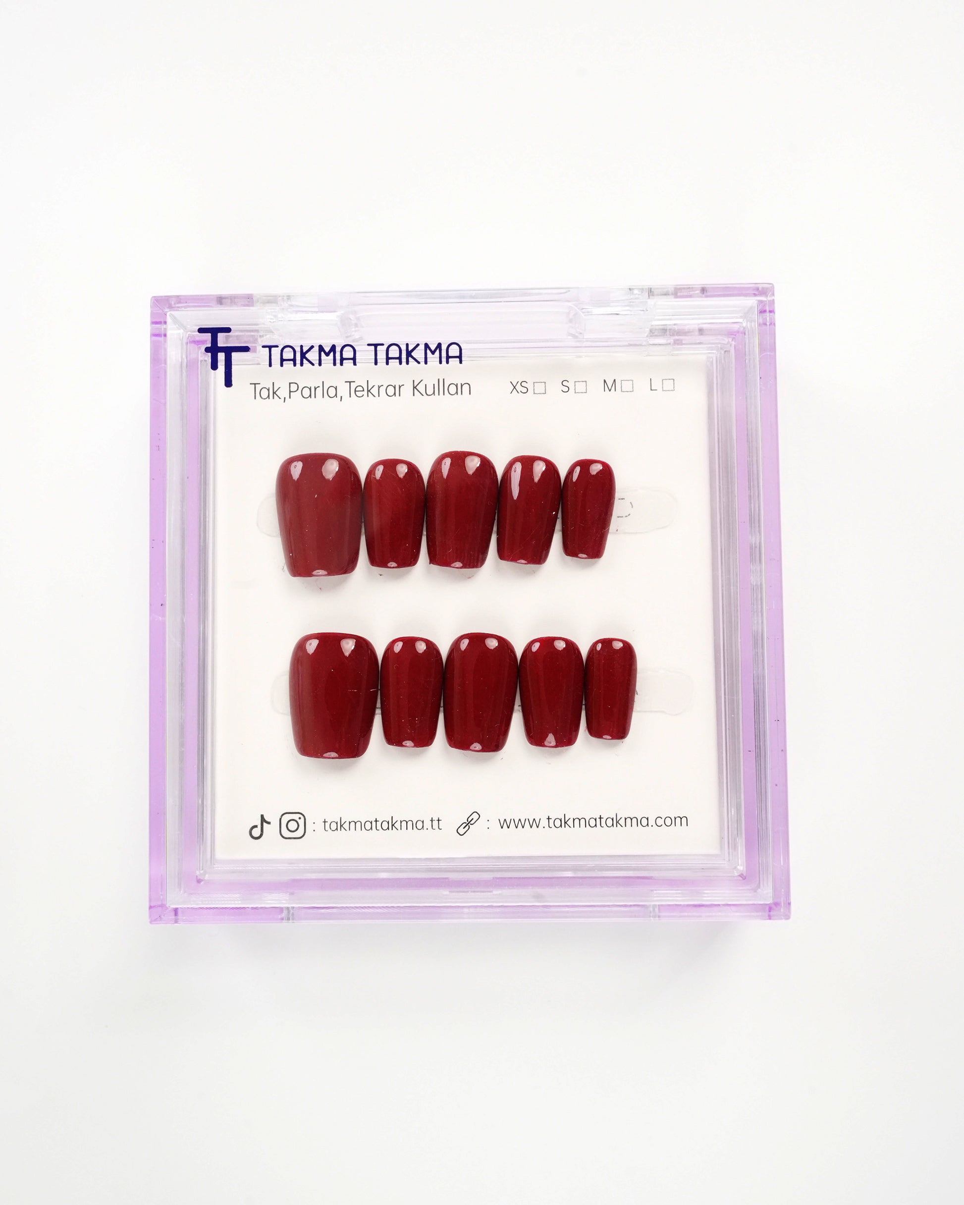 TakmaTakma tırnaklarınızı istediğiniz zaman çıkarıp tekrar takabilirsiniz, üstelik zahmetsizce! İstediğiniz gibi kullanabilir, her an şıklığınızı yenileyebilirsiniz.
