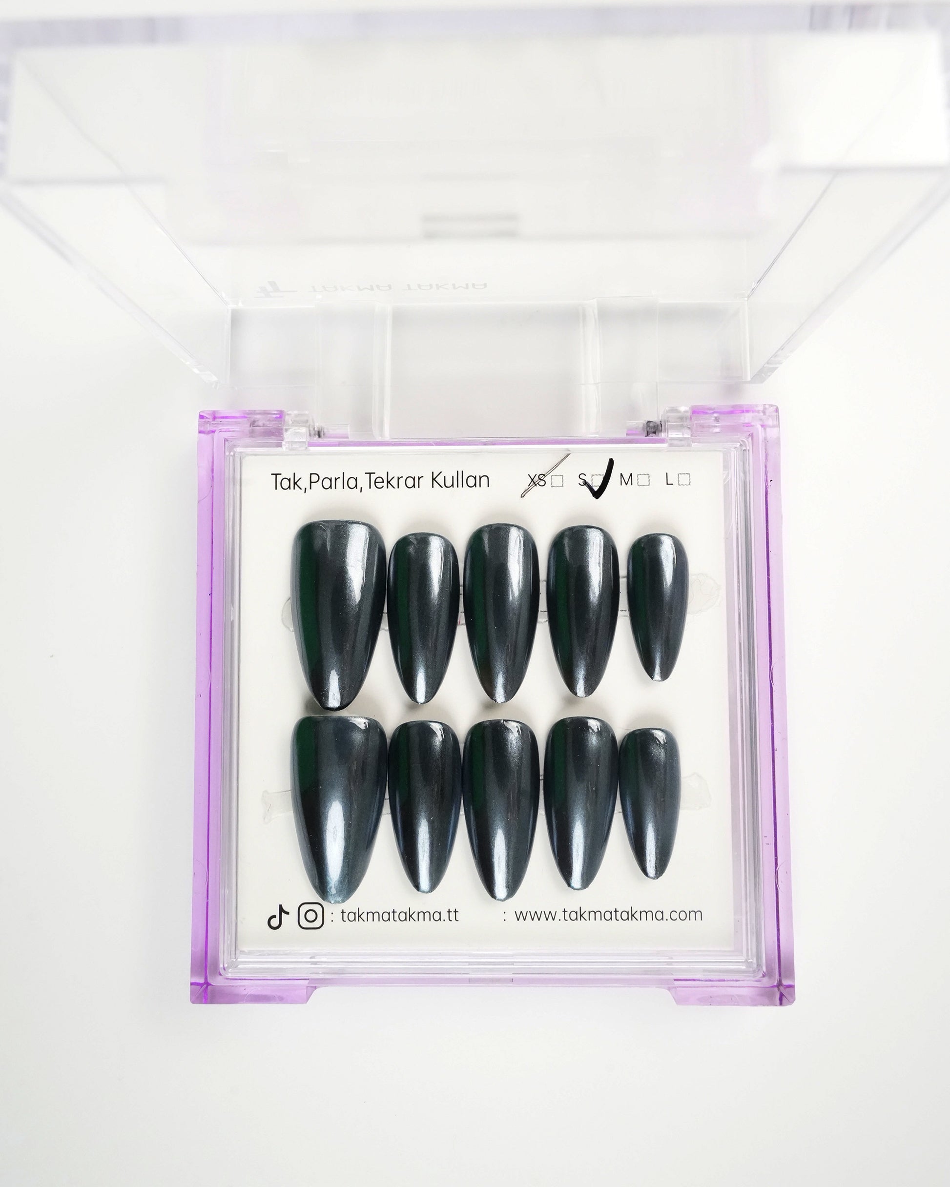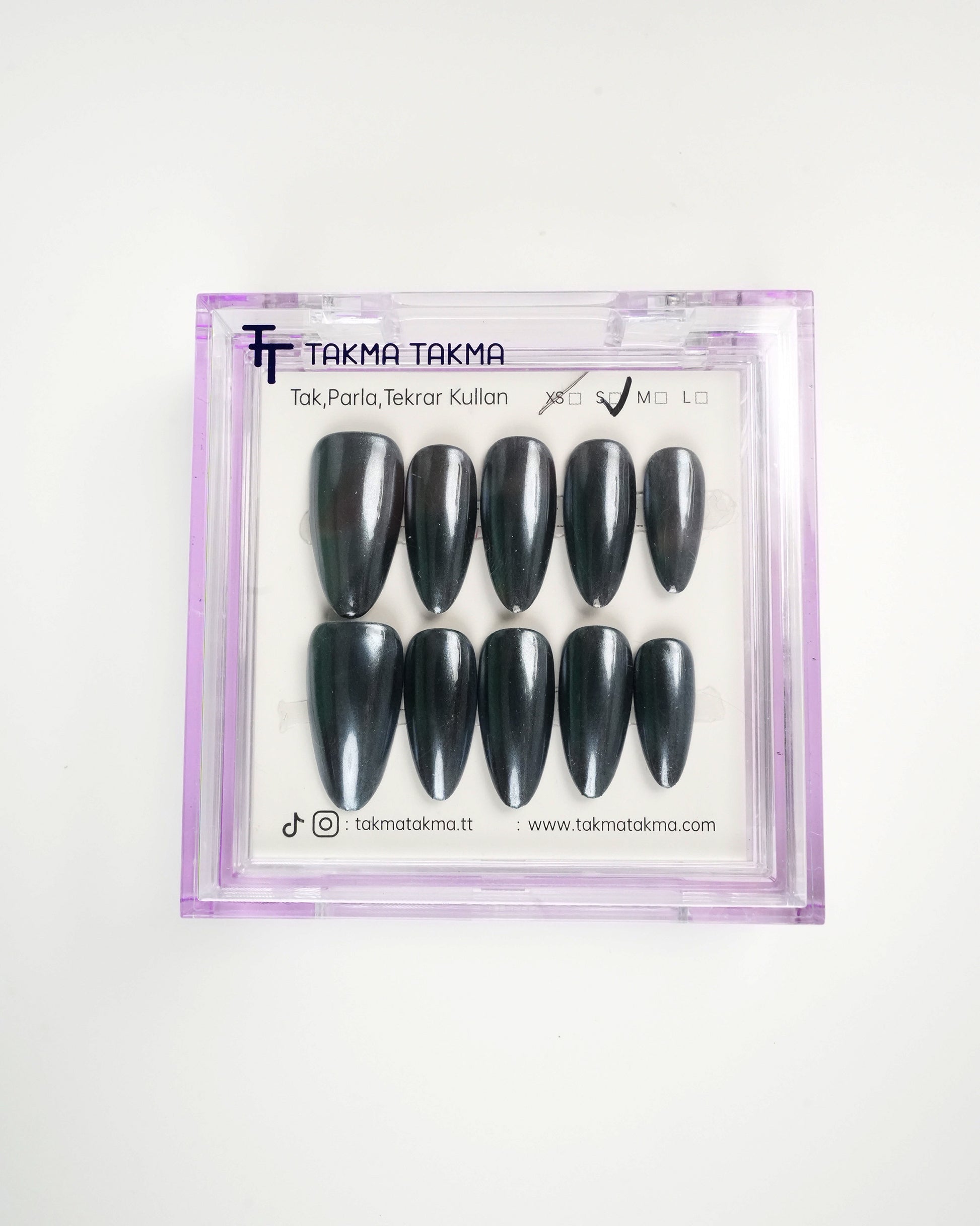 TakmaTakma tırnaklarınızı istediğiniz zaman çıkarıp tekrar takabilirsiniz, üstelik zahmetsizce! İstediğiniz gibi kullanabilir, her an şıklığınızı yenileyebilirsiniz.