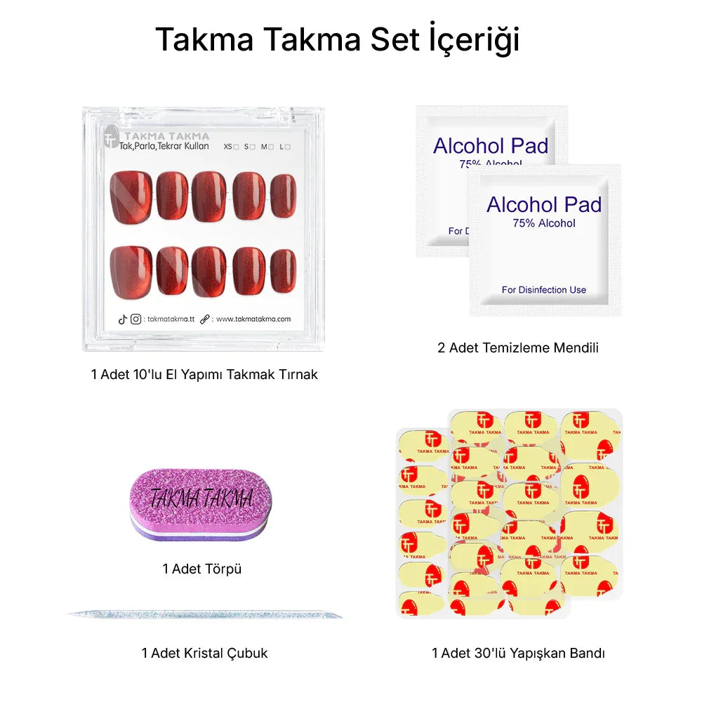 TakmaTakma tırnaklarınızı istediğiniz zaman çıkarıp tekrar takabilirsiniz, üstelik zahmetsizce! İstediğiniz gibi kullanabilir, her an şıklığınızı yenileyebilirsiniz.