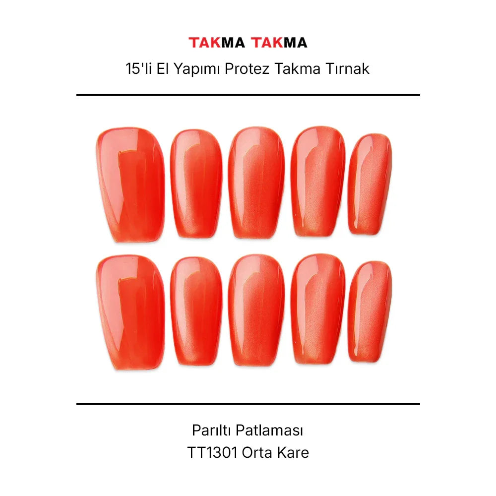 15'li Kırmızı Orta Kare TT1301 Tekrar Kullanılabilir El Yapımı Protez Takma Tırnak