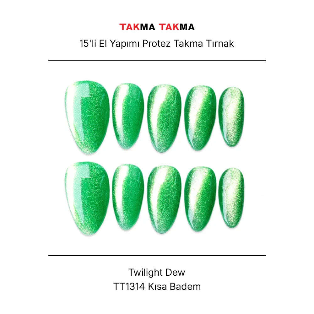 15'li Yeşil Kısa Badem TT1314 Tekrar Kullanılabilir El Yapımı Protez Takma Tırnak
