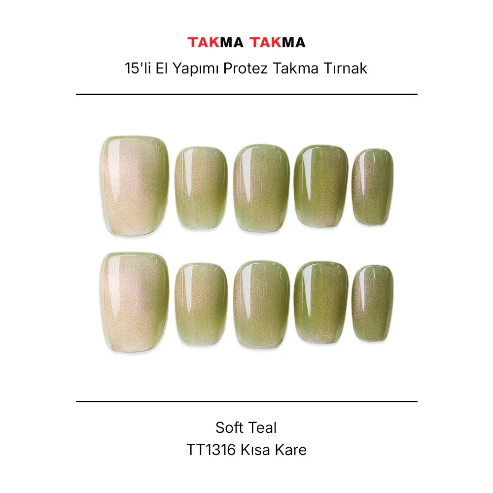 15'li Yeşil Kısa Kare TT1316 Tekrar Kullanılabilir El Yapımı Protez Takma Tırnak