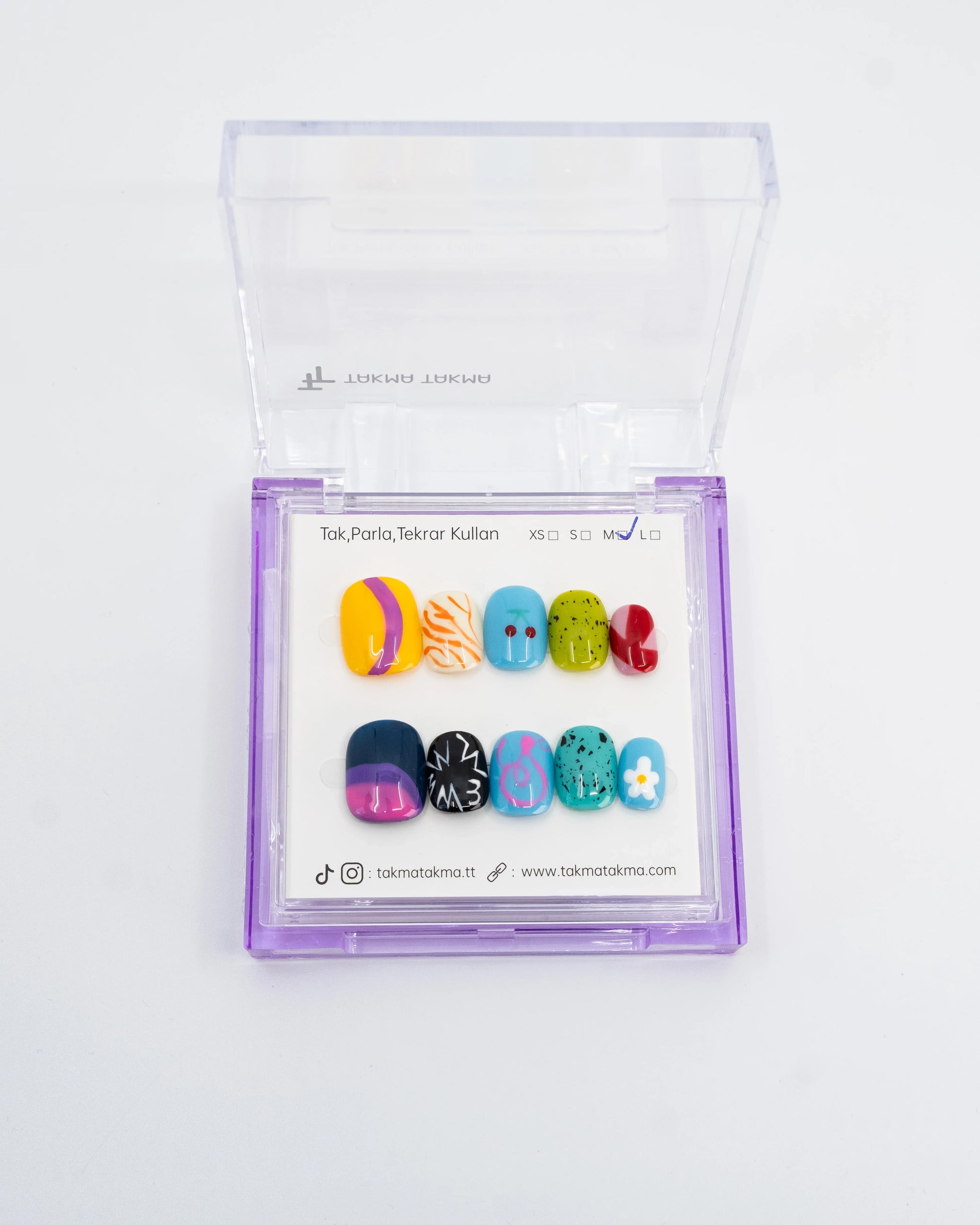 TakmaTakma tırnaklarınızı istediğiniz zaman çıkarıp tekrar takabilirsiniz, üstelik zahmetsizce! İstediğiniz gibi kullanabilir, her an şıklığınızı yenileyebilirsiniz.
