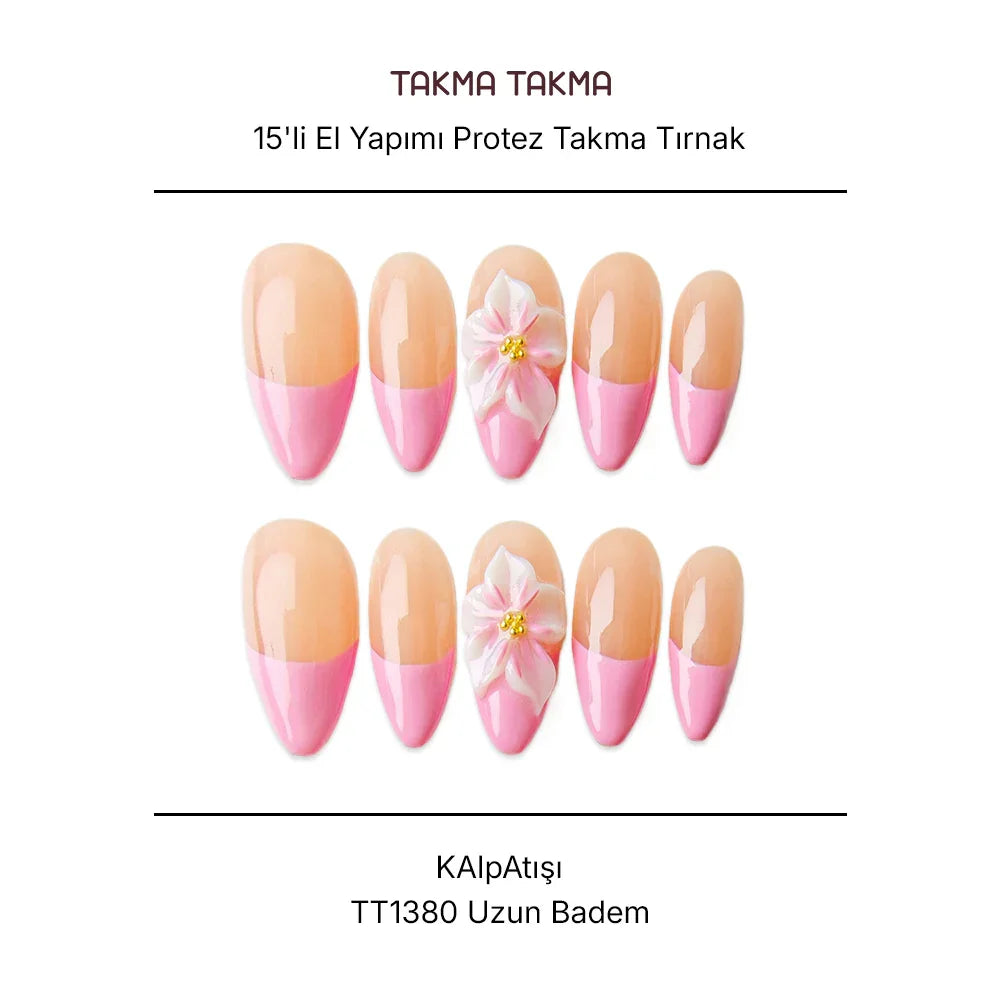 15'li Pembe Uzun Badem TT1380 Tekrar Kullanılabilir El Yapımı Protez Takma Tırnak