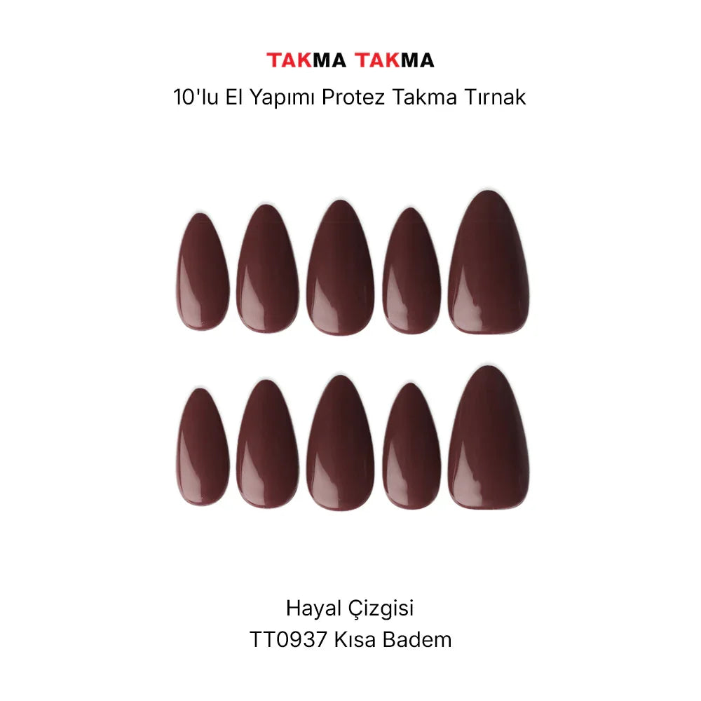 10'lu Bordo Kısa Badem TT0937 Tekrar Kullanılabilir El Yapımı Protez Takma Tırnak